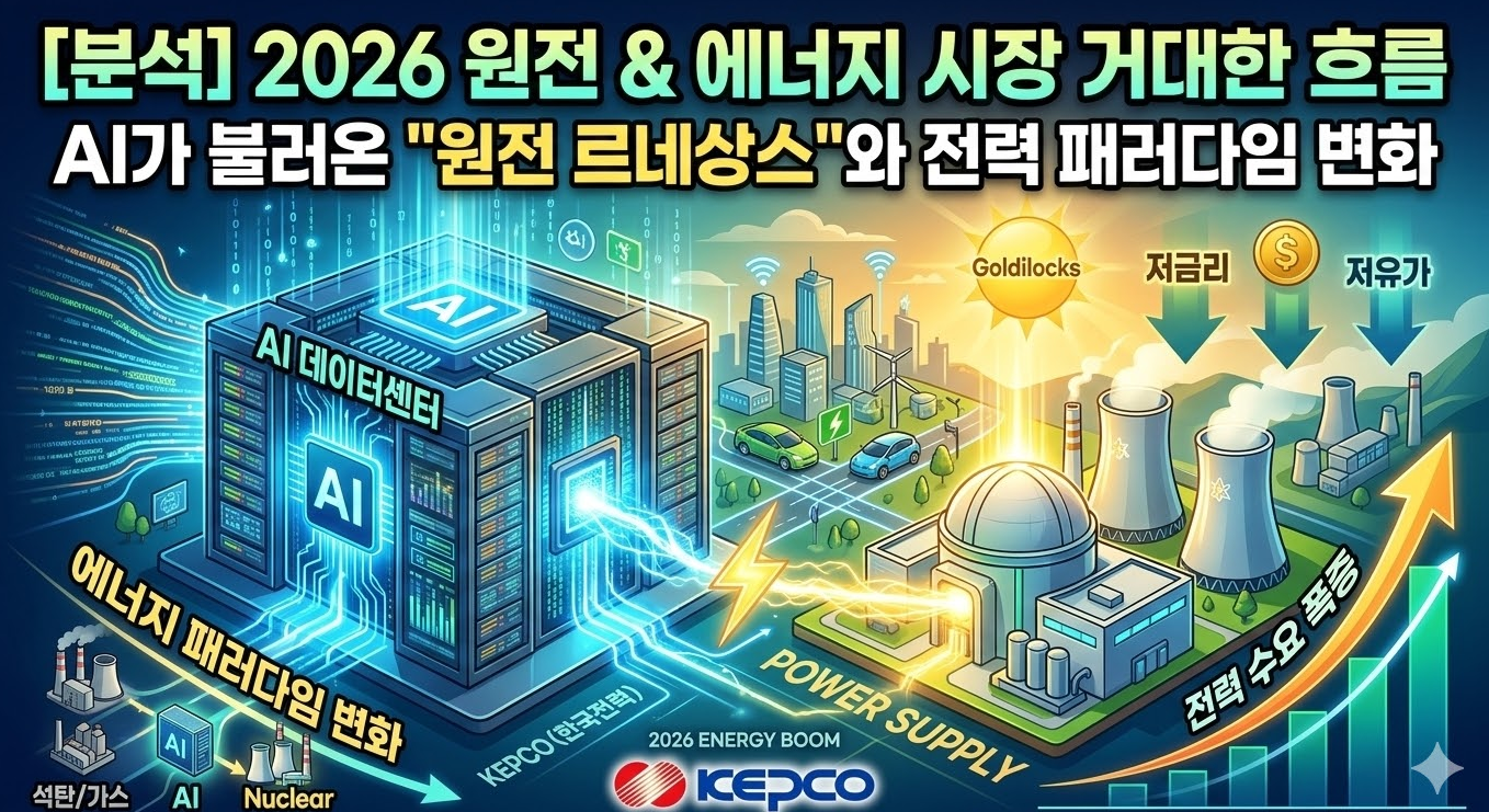 2026년 에너지 시장은 저금리와 저유가 기조가 맞물리는 '골디락스(Goldilocks)' 시기에 진입할 것으로 기대되는 가운데, AI 데이터센터 확충에 따른 전력 수요 폭증이 시장의 판도를 완전히 바꾸는 '게임 체인저'가 될 전망입니다. 특히 원자력 발전은 AI 시대를 지탱하는 필수 에너지원으로 부상하며 유례없는 호황기를 맞이할 것으로 분석됩니다.